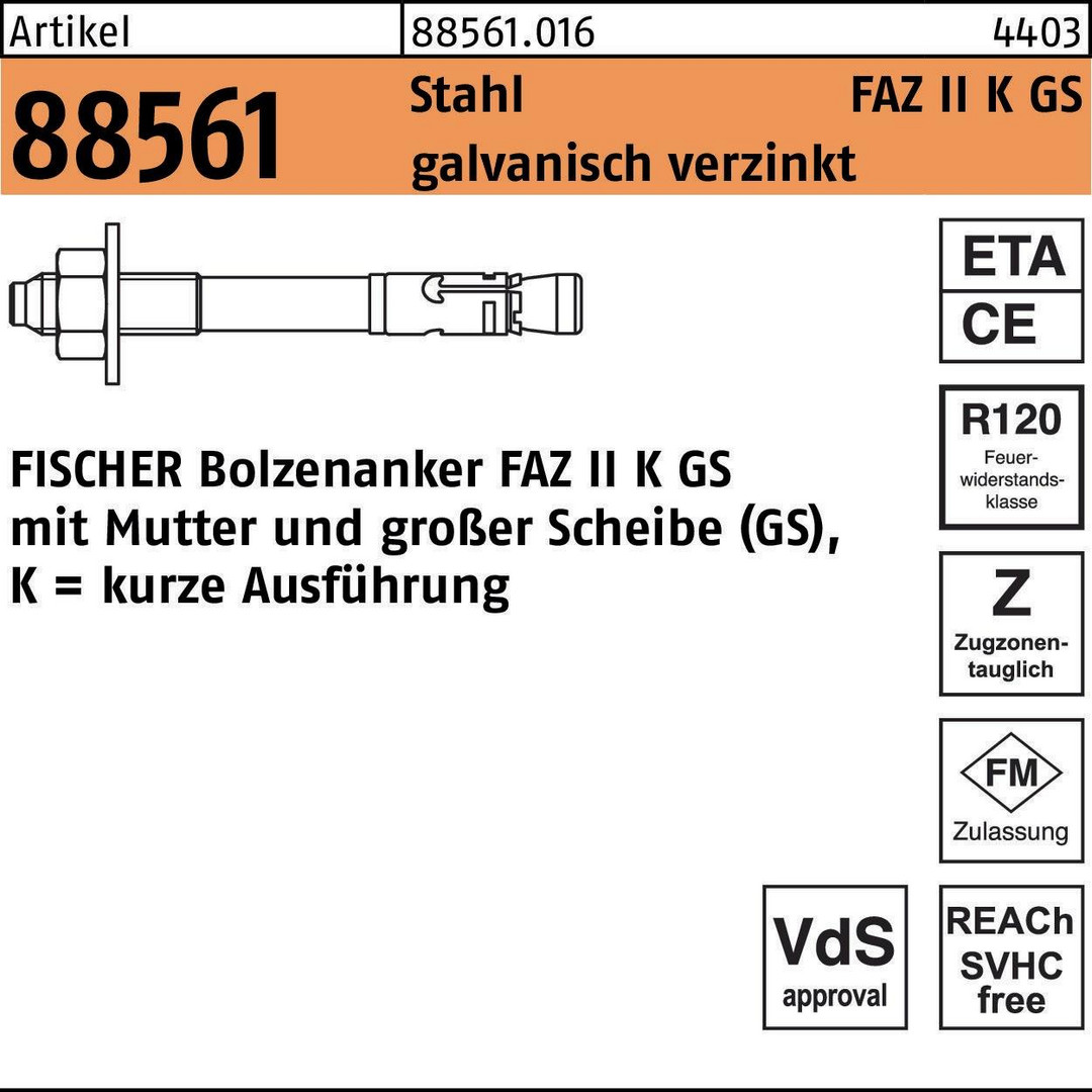 Artikel 88561 Stahl FAZ II K GS galvanisch verzinkt FISCHER Bolzenanker FAZ II K GS mit Mu. und großer Scheibe · kurze Ausführung - Abmessung: FAZ II 10/ 10K GS VE=S (50 Stück)