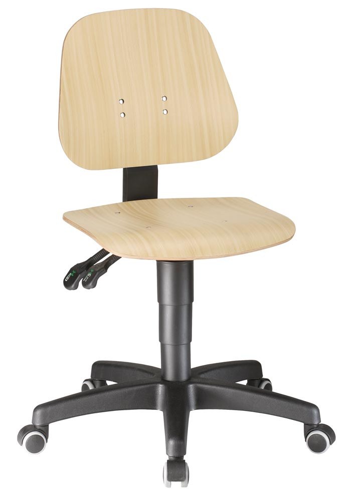 nach DIN 68877 · bedienungsfreundliche Gasfeder-Sitzhöhenverstellung · ergonomisch geformter Sitz und Rückenlehne, mit körpergerecht geformtem, mehrfach verleimtem Buchenschichtholz, naturfarben lackiert · Rückenlehne pendelnd gelagert miit stufenloser Neigungsverstellung und 10-facher Höhenverstellung · Fünffuß-Untergestell aus Kunststoff, flach auslaufend, kipp- und stolpersicher · Untergestell mit lastabhängig gebremsten Sicherheits-Doppelrollen für harte Boden