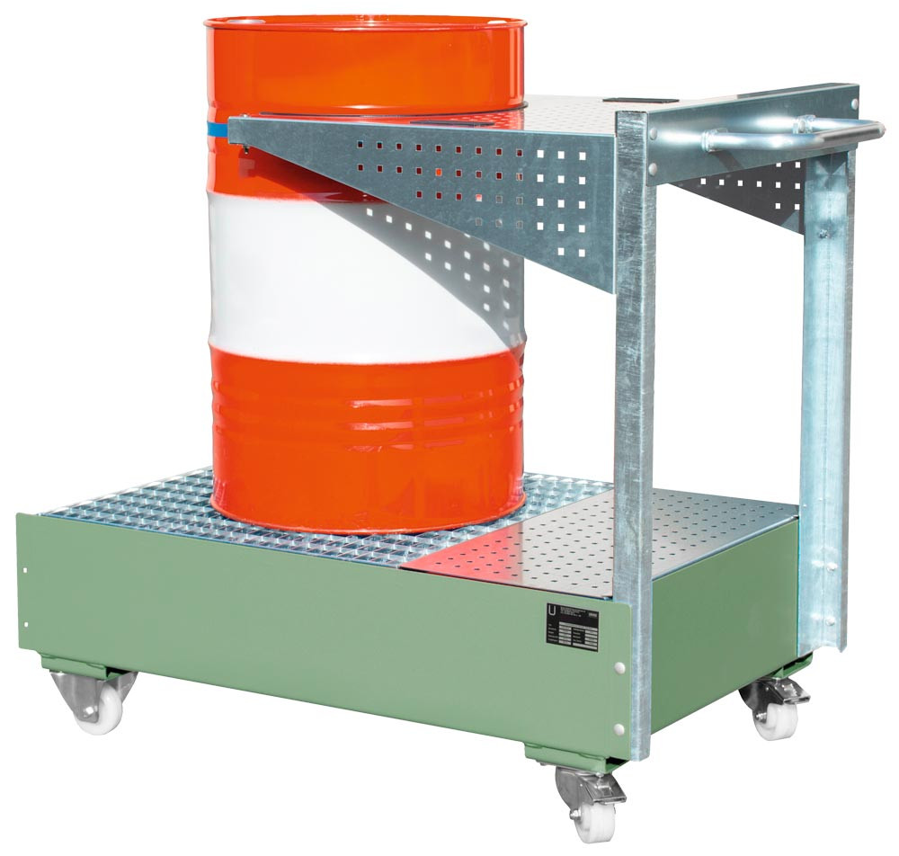 Auffangwanne mit Lochplatte, 3 mm Stahlblech, RAL 6011, fahrbar, für 1 St. 200-l-Fass, stehend Lagern, BxTxH 1450x800x1195 mm, Auffangvol. 215 l