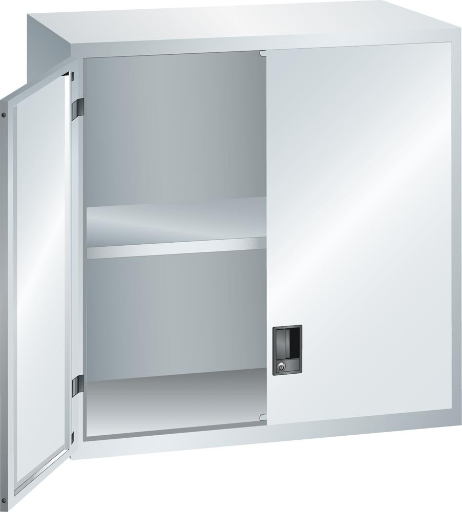 ∙ Aus hochwertigem, pulverbeschichtetem Stahlblech ∙ Flügeltüren, einschlagend aus einem Stück gekantet, Öffnungswinkel 115°, schließen bündig mit dem Gehäuse ab ∙ Inneneinrichtung im 25 mm Raster in der Höhe verstellbar ∙ Inkl. 1 Verstellboden verzinkt, 30 mm stark, max. Traglast 60 kg