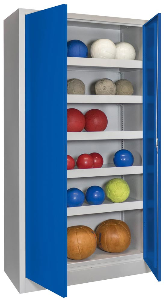 Ballschrank m. Vollblech Flügeltüren, BxTxH 1000x500x1950 mm, 5 lackierte Verstellböden mit Aufkantung, Schloss, RAL 7035/5012 E6020968