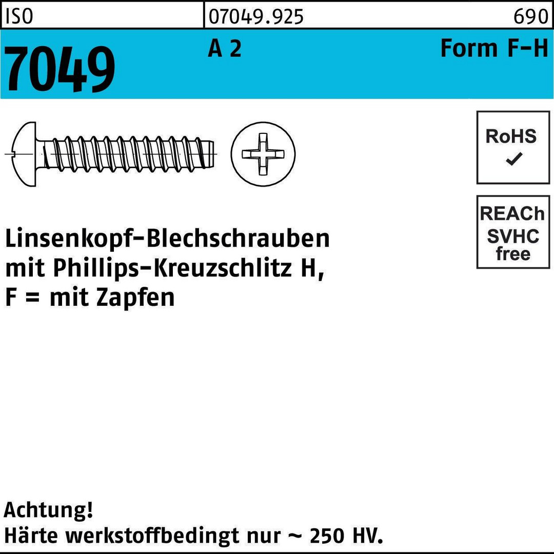 ISO 7049 A 2 Form F-H Linsenkopf-Blechschrauben mit Zapfen · mit Phillips-Kreuzschlitz H - Abmessung: 2,9 x 6,5 -F-H VE=S (1000 Stück )