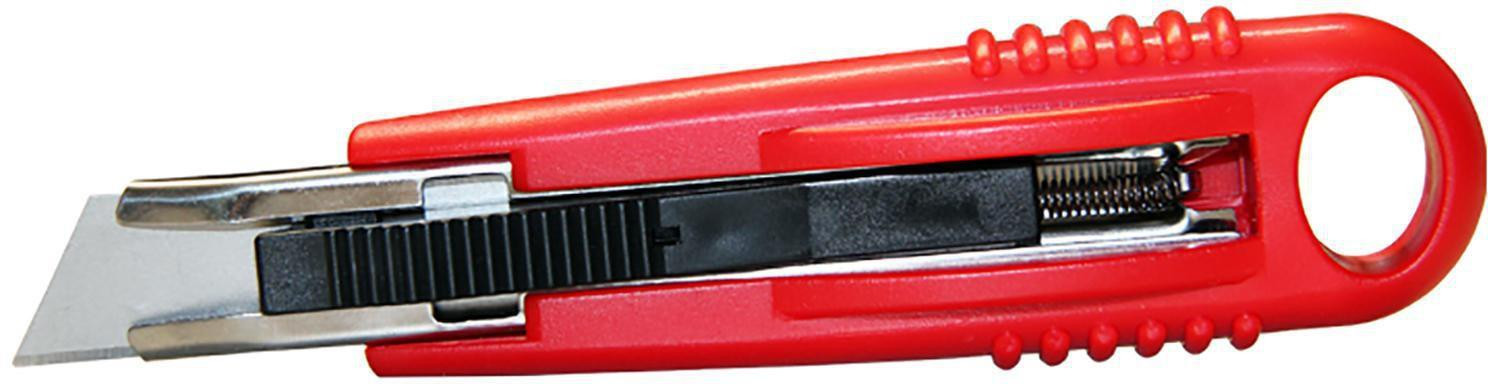 Klinge besitzt Rückzugfeder für mehr Sicherheit beim Abrutschen vom Schneidgut Schieber muss während dem Schneiden nicht festgehalten werden Griffkörper aus Kunststoff Mit genoppter Gummiauflage auf der Rückseite Klingenführung aus Metall Leichter Klingenwechsel TÜV-geprüft In rot Masse: 145 x 25 x 35 mm (L x B x H)