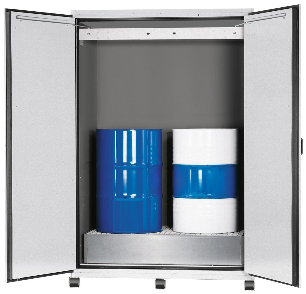 Fass-Schrank für 2x200-l-Fässer, BxTxH 1555x1018x2324 mm, inkl. Auffangwanne 220 l m. Gitterrost und Türfeststellanlage, RAL 7035, inkl. Transp.sockel