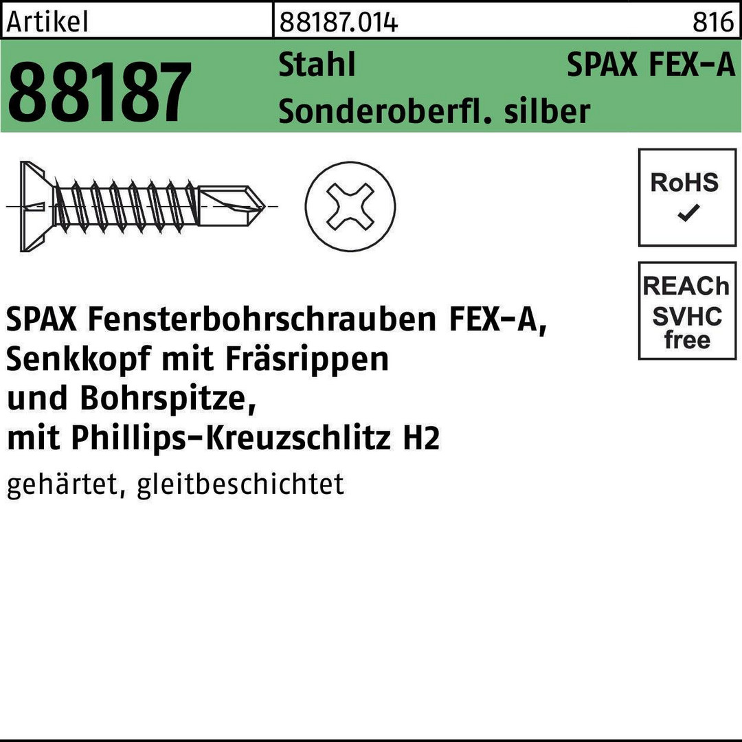 Artikel 88187 Stahl SPAX FEX-A Sonderoberfl. silber SPAX Fensterbohrschrauben FEX-A mit Senkkopf · Bohrsp. · Phillips-KS - Abmessung: 3,9 x 19 -H VE=S (1000 Stück )
