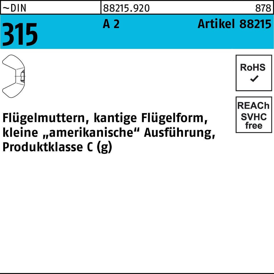 | Typenbezeichnung | Flügelmuttern, kantige Flügelform, kleine "amerikanische" Ausführung, Produktklasse C (g) |