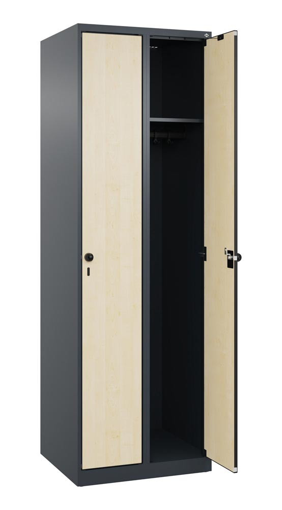 Garderobenschrank, bodenstehend, 2 Abt., Abt.B 300 mm, BxTxH 600x500x1850 mm, HPL-Dekorfront, RAL 7016/Dekor Ahorn
