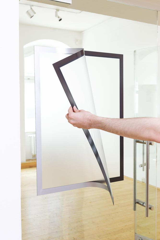 · Auf Glasflächen beidseitig lesbar · Beidseitig eingefärbter Rahmen · Vollflächige Selbstklebefolie auf der Rückseite · Einfaches Anbringen auf glatten, tragfähigen Oberflächen ohne Hilfsmittel; kann z. B. von Glas wieder entfernt werden · Aufklappbare, magnetische Vorderseite
