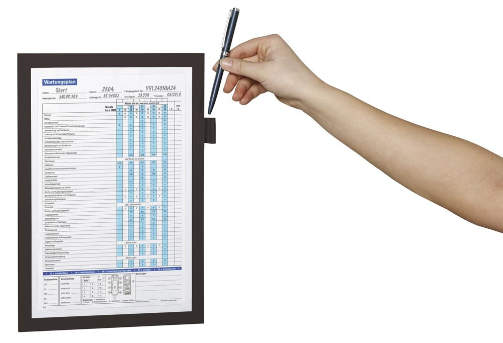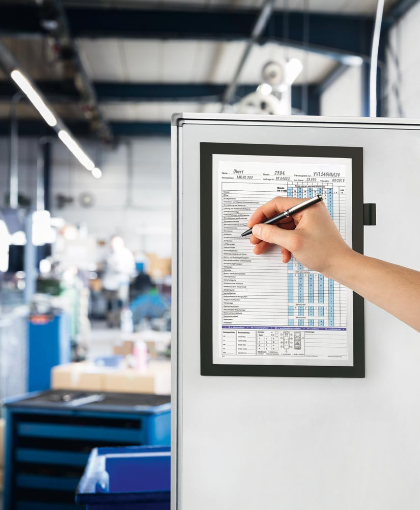 ∙ Direktes Beschriften des Dokuments möglich, da Aussparung auf der Vorderseite ∙ Der Magnetrahmen haftet auf allen metallischen Oberflächen ∙ Mit Stiftehalter für alle Stifte mit Befestigungsclip