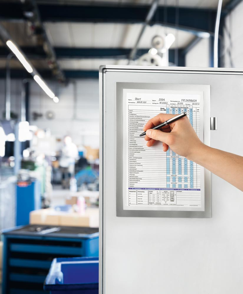 ∙ Direktes Beschriften des Dokuments möglich, da Aussparung auf der Vorderseite ∙ Der Magnetrahmen haftet auf allen metallischen Oberflächen ∙ Mit Stiftehalter für alle Stifte mit Befestigungsclip