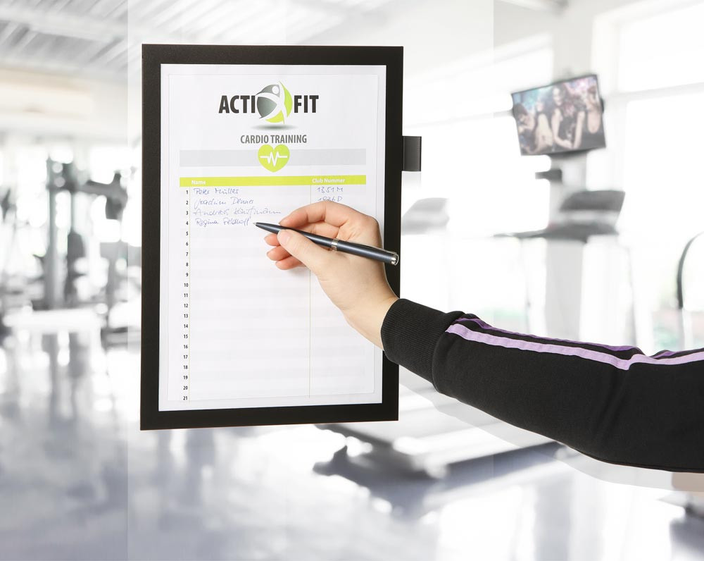 selbstklebend · Format DIN A4 · magnetische Vorderseite für schnelles und bequemes Wechseln von Informationen · direktes Beschriften des Dokumentes · Füllhöhe bis zu 5 Blatt 80g/qm · Stiftehalter für alle Stifte mit Befestigungsclip · haftet dauerhaft auf allen glatten Oberflächen