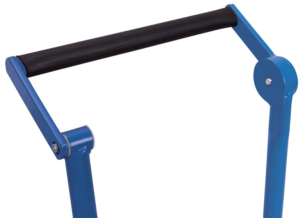 · Schweißkonstruktion aus Stahlrohr und innovativem L-Profil · RAL 5010 enzianblau pulverbeschichtet · Schlag- und kratzfest · Klappbarer Rohrschiebegriff mit Totmannsteuereung · Ladefläche aus Holzwerkstoffplatte mit Buchendekor · 2 Lenk- und 2 Bockrollen · Lenkrollen mit Totmannbremse · Thermoplastische Vollgummi-Bereifung, grau "spurlos" · Naben mit Präzision-Rillenkugellager und Fadenschutz