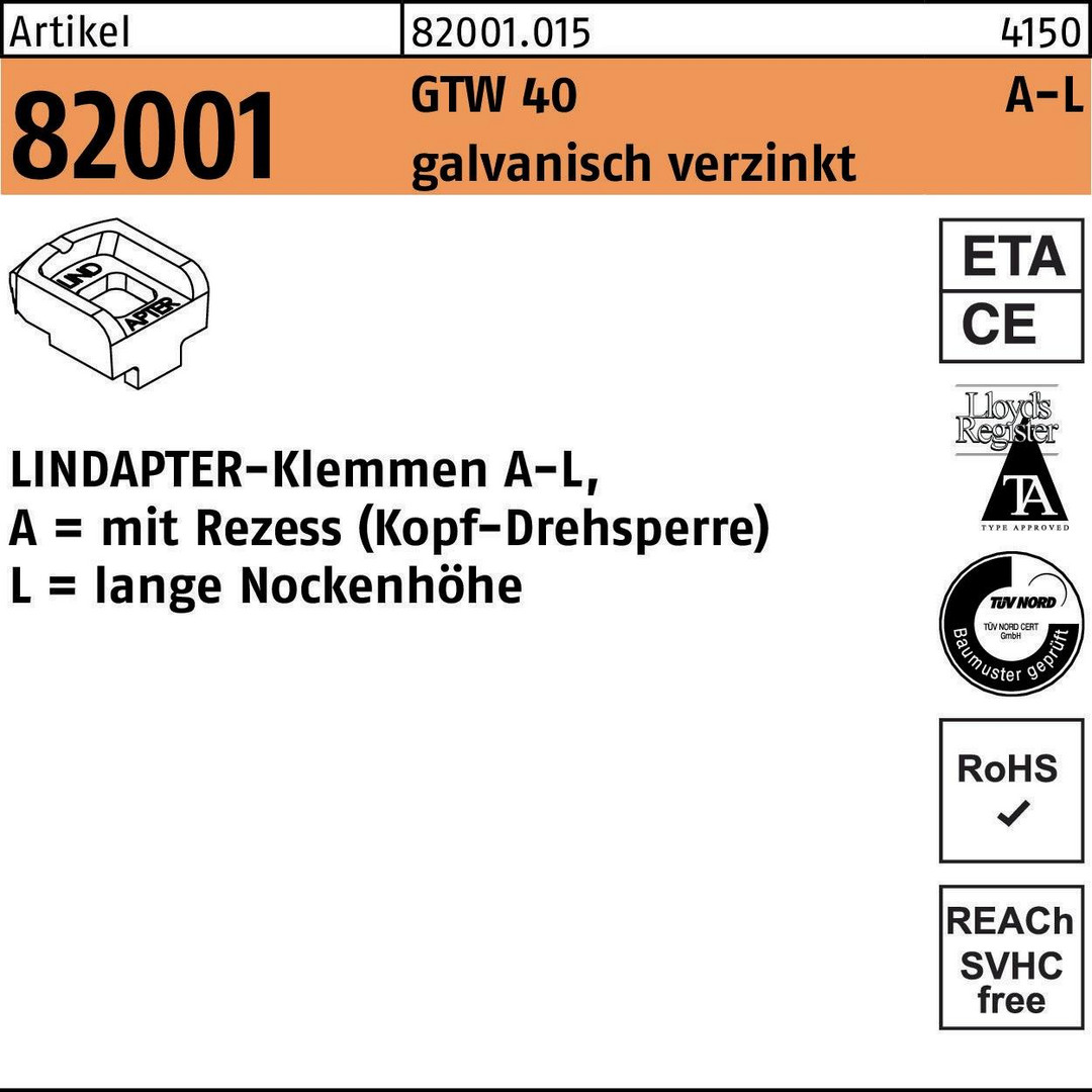 Artikel 82001 GTW 40 A-L galvanisch verzinkt LINDAPTER-Klemmen A-L mit Rezess (Kopf-Drehsperre) · lange Nockenhöhe - Abmessung: LM 20 / 12,5 VE=S (1 Stück )