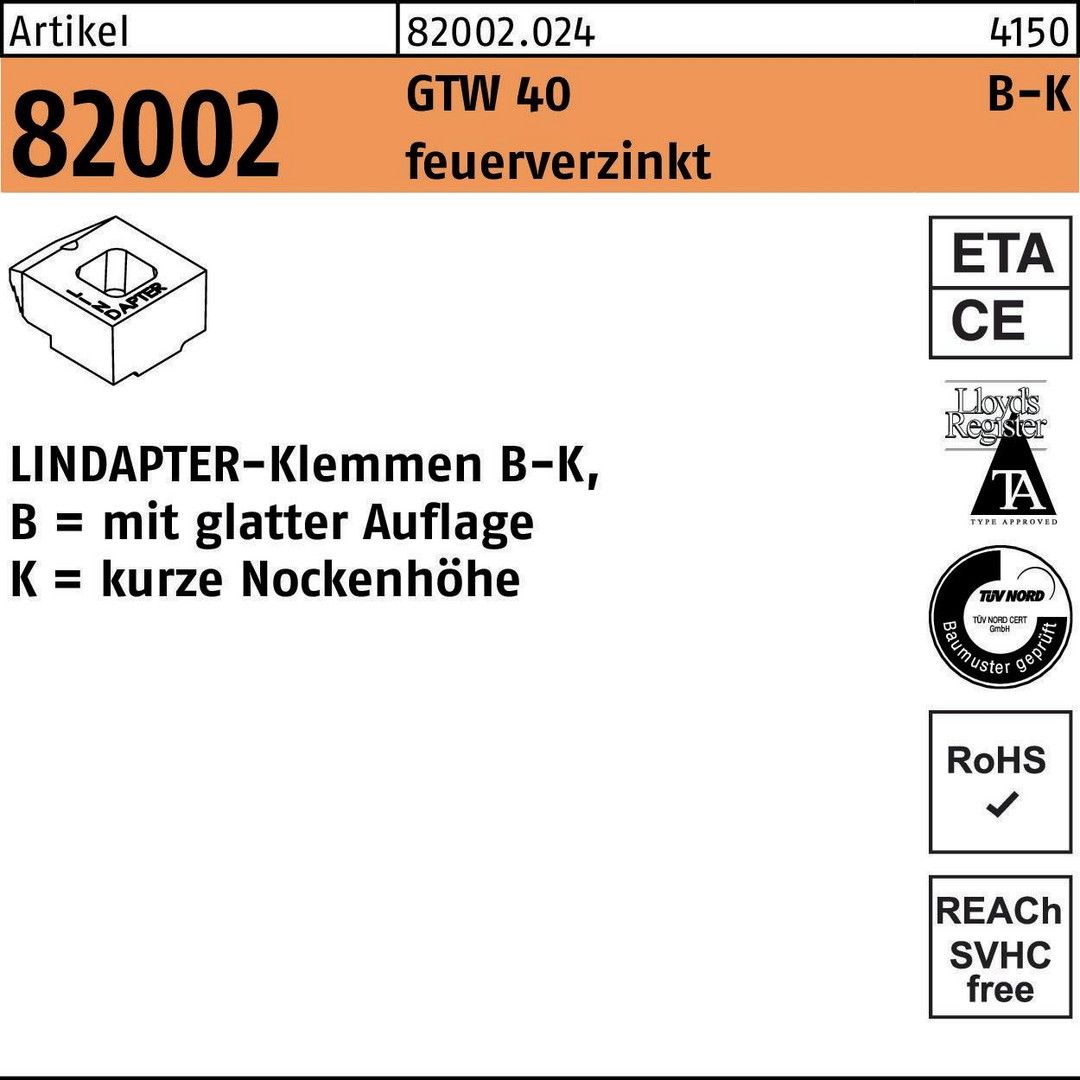 Artikel 82002 GTW 40 B-K feuerverzinkt LINDAPTER-Klemmen B-K mit glatter Auflage · kurze Nockenhöhe - Abmessung: KM 12 / 4,5 VE=S (1 Stück )