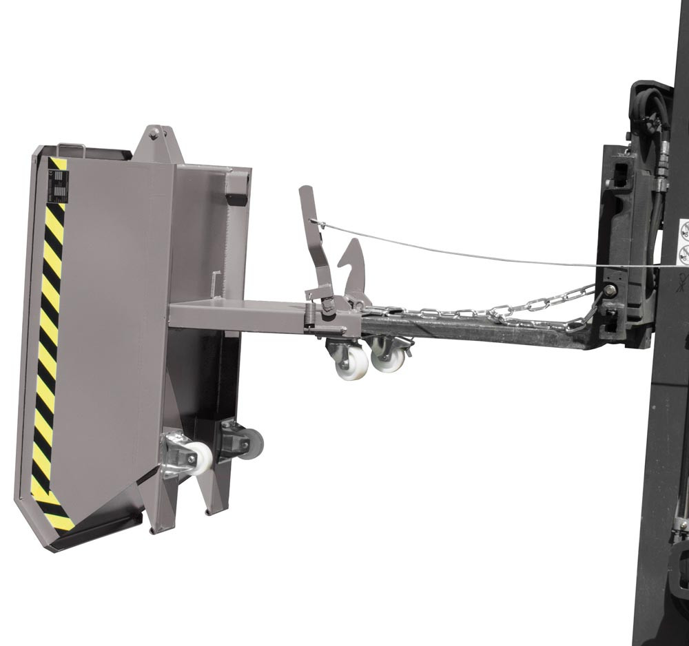 · Extrem niedrige Schüttkantenhöhe von 350 mm ∙ Mit kippbarer Mulde, 3 mm Wannenblech mit umlaufendem Randprofil ∙ Günstiger Kippwinkel, Kippen in jeder Höhe per Seilzug ∙ Sicherung gegen unbeabsichtigtes Abrutschen und Auskippen ∙ Robuste Stahlblechkonstruktion ∙ Stabiler Grundrahmen mit Einfahrtaschen · Ideal für den Einsatz unter Maschinen