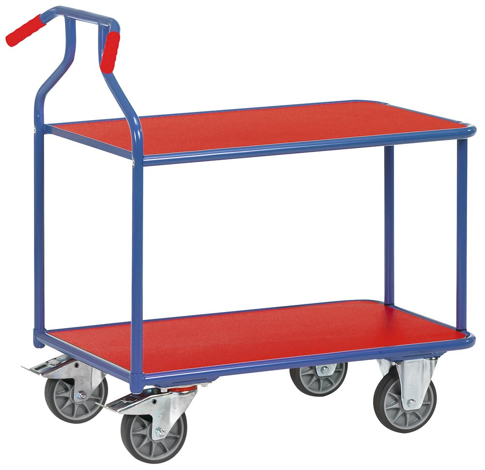 ∙ Schweißkonstruktion aus Stahlrohr ∙ Stahlgestell pulverbeschichtet in RAL 5007 brillantblau ∙ Schlag- und kratzfest ∙ Ladefläche Holzwerkstoffplatte mit farbiger Kunststoffoberfläche in rot · Etagenhöhen 230/735 mm · Traglast obere Ladefläche 200 kg · 2 Lenk- und 2 Bockrollen ∙ Lenkrollen gemäß EN 1757-3 mit Rad-Feststeller ∙ TPE-Bereifung ∙ Naben mit Rillenkugellager