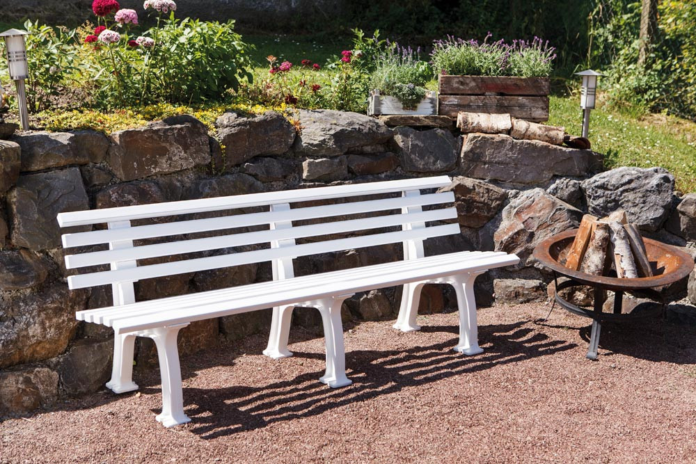 ∙ Witterungsbeständig ∙ Mit 5 Sitz- und 4 Rückenlatten 50 x 30 mm aus stabilem PVC ∙ Füße aus Polypropylen ∙ Wahlweise 1500 mm Breite mit 2 Füßen oder 2000 mm Breite mit 3 Füßen in 4 Farben