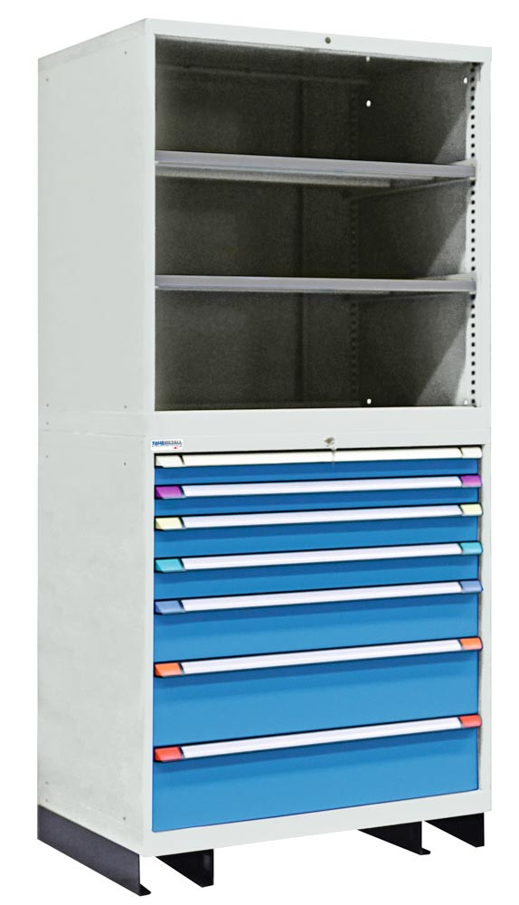 Schubladenregal, Grundfeld, 2 Verstellböden, 7 Schubladen, Traglast je 75 kg, Sockel, BxTxH 1005x695x2100 mm, RAL 7035/5012 E6011350
