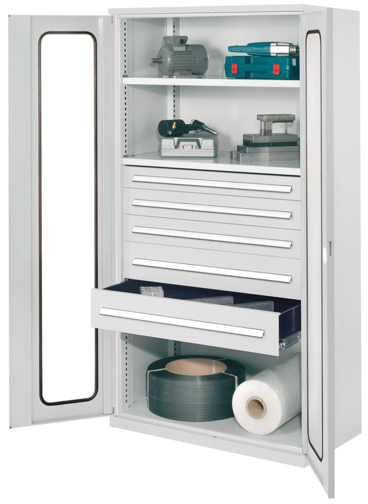 Schwerlastschrank, Sichtfenstertüren, 2 Fachböden, Schubl. 1x100, 2x125, 2x175 mm, BxTxH 1000x600x1950 mm, RAL 7035