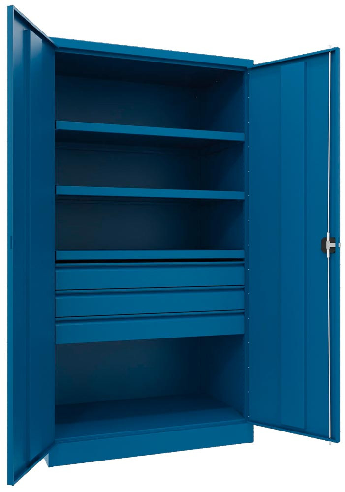 Schwerlastschrank, Vollblechtüren, ohne Trennwand, 3 Böden, 120 kg Traglast, 2 Schubl. 175 mm, BxTxH 1040x630x1950 mm, RAL 5010 E6490122