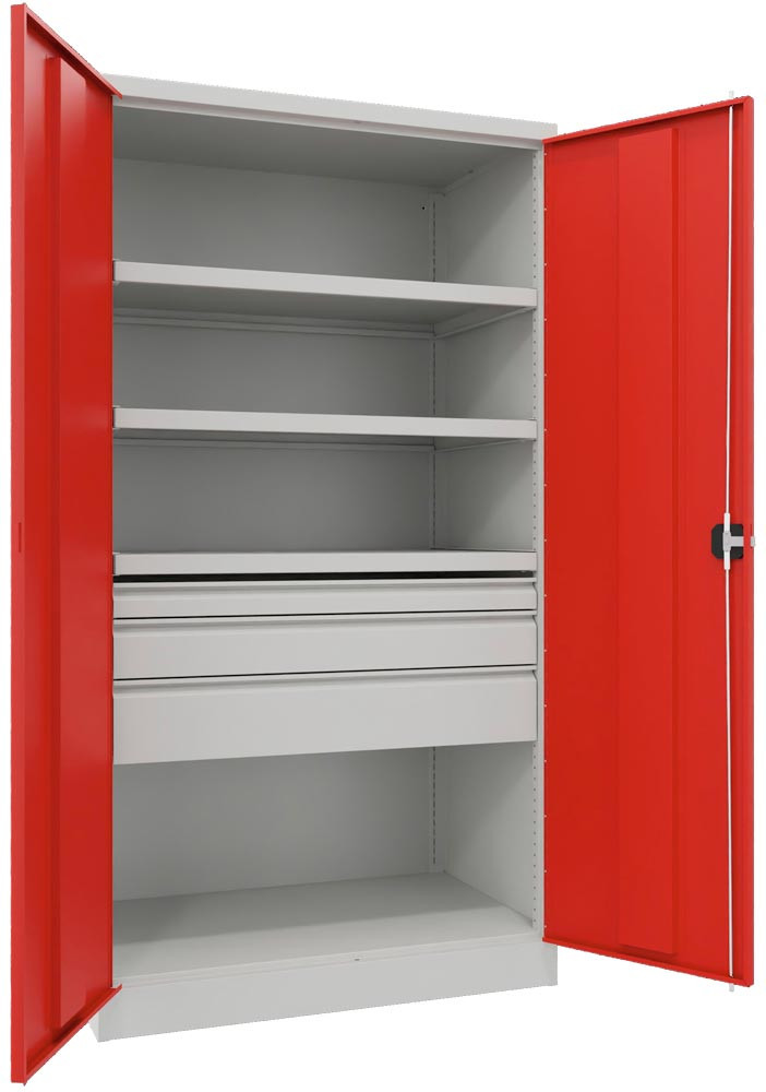 Schwerlastschrank, Vollblechtüren, ohne Trennwand, 3 Böden, 200 kg Traglast, 2 Schubl. 175 mm, BxTxH 1040x630x1950 mm, RAL 5010 E6490150