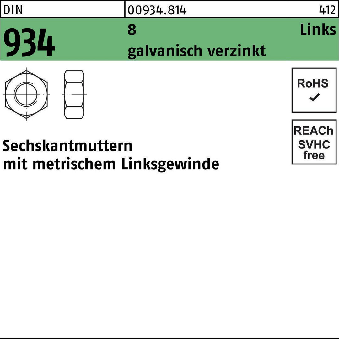 Sechskantmutter DIN 934 links M5 -LH 8 galv.verz. 100 Stück 8000175725