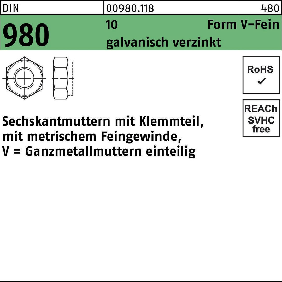 DIN 980 10 Form V-Fein galvanisch verzinkt Sechskantmuttern mit Klemmteil · mit metr. Feingew. · Ganzmetallmutter - Abmessung: VM 14 x 1,5 VE=S (100 Stück )