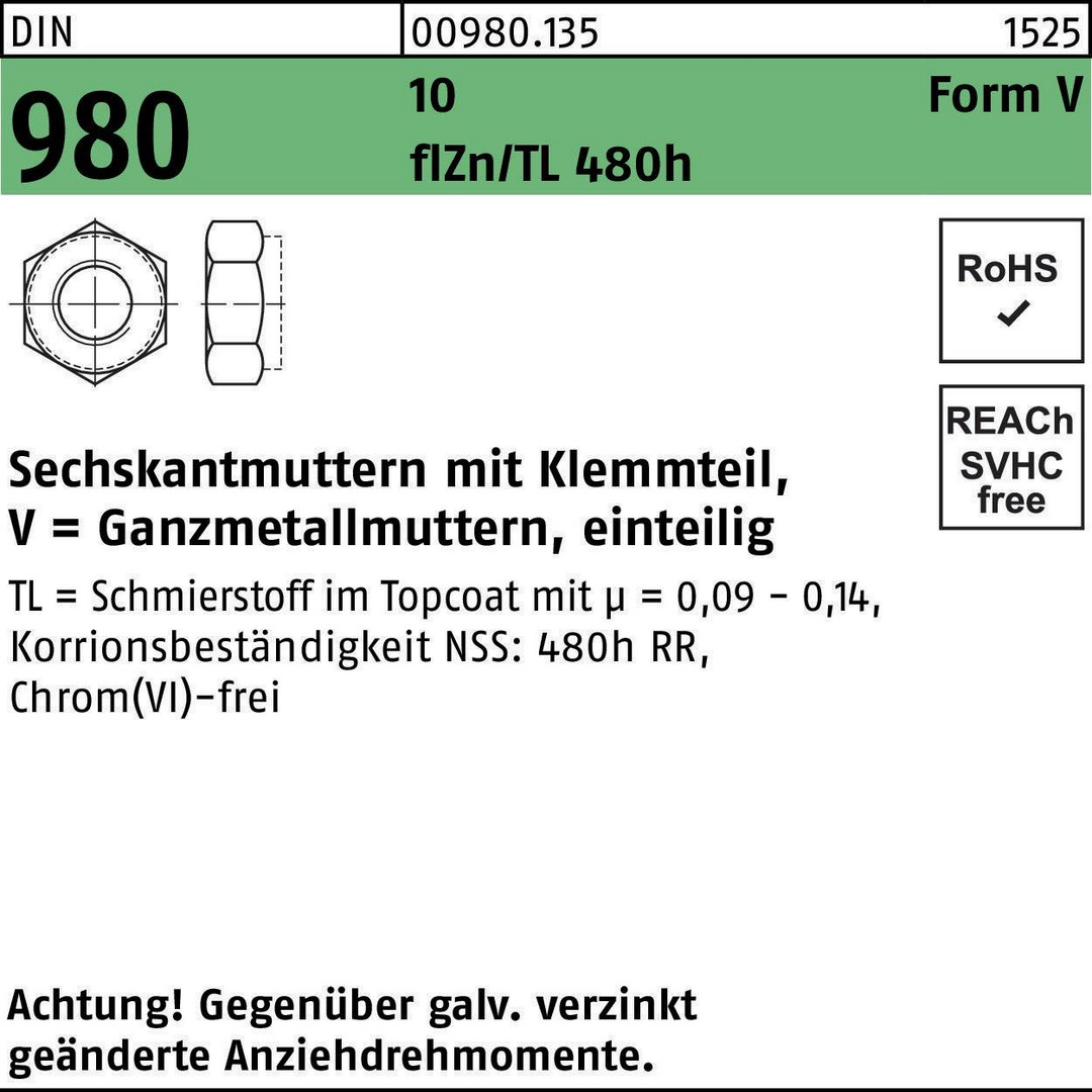 DIN 980 10 Form V flZn/TL 480h (zinklamellenbesch.) Sechskantmuttern mit Klemmteil · Ganzmetallmuttern · einteilig - Abmessung: VM 8 VE=S (500 Stück )