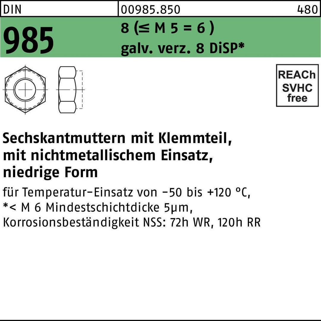 DIN 985 8 (<=M 5 = 6 ) galv. verz. 8 DiSP Sechskantmuttern mit Klemmteil · mit nichtmetallischem Einsatz · niedrige Form - Abmessung: M 3 VE=S (1000 Stück )