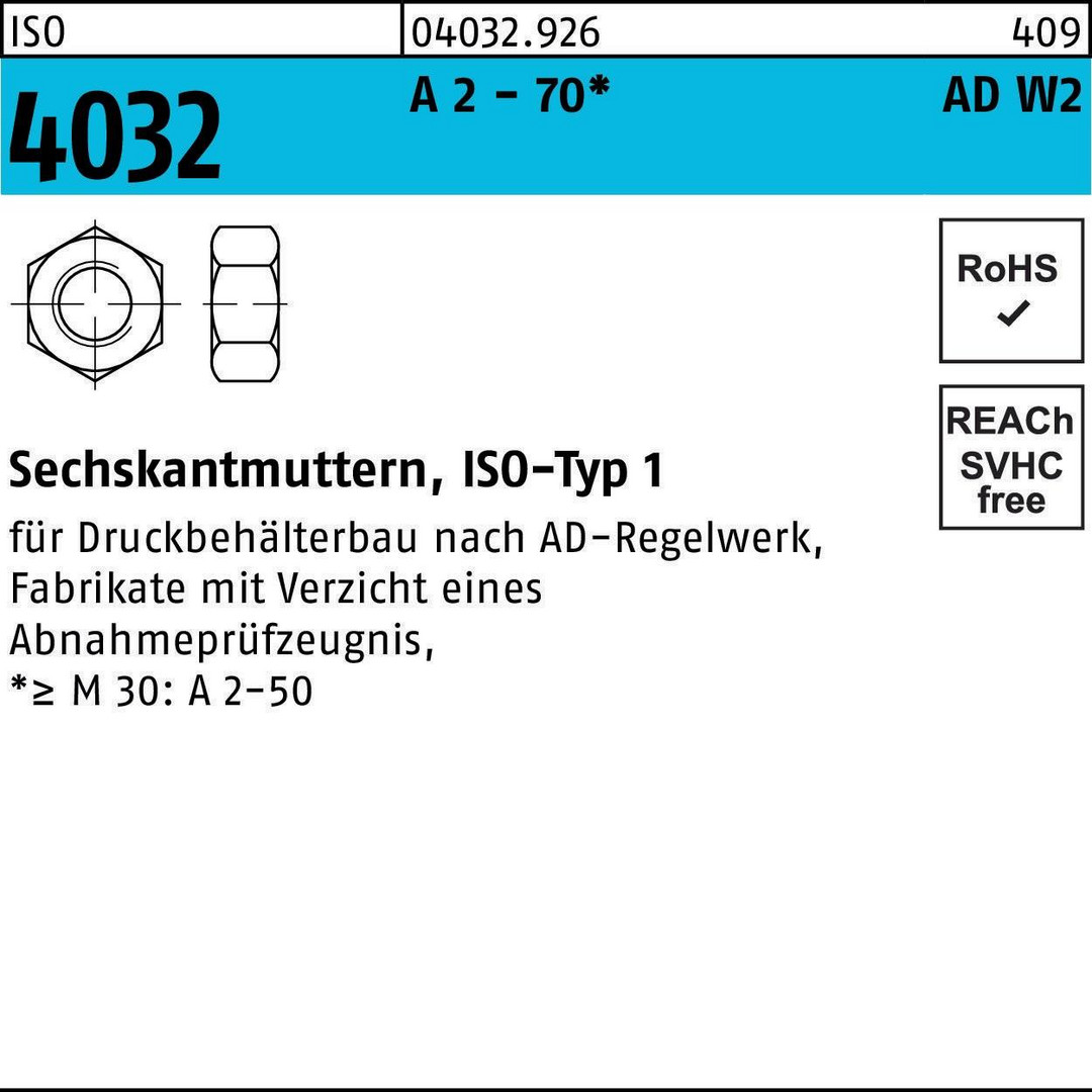 ISO 4032 A 2 - 70 AD W2 Sechskantmuttern - Abmessung: M 30 VE=S (10 Stück )