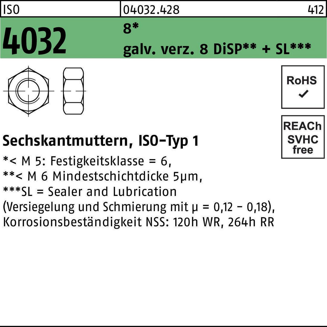 Sechskantmutter ISO 4032 M14 8 galv.verz. 8 DiSP + SL 200 Stück