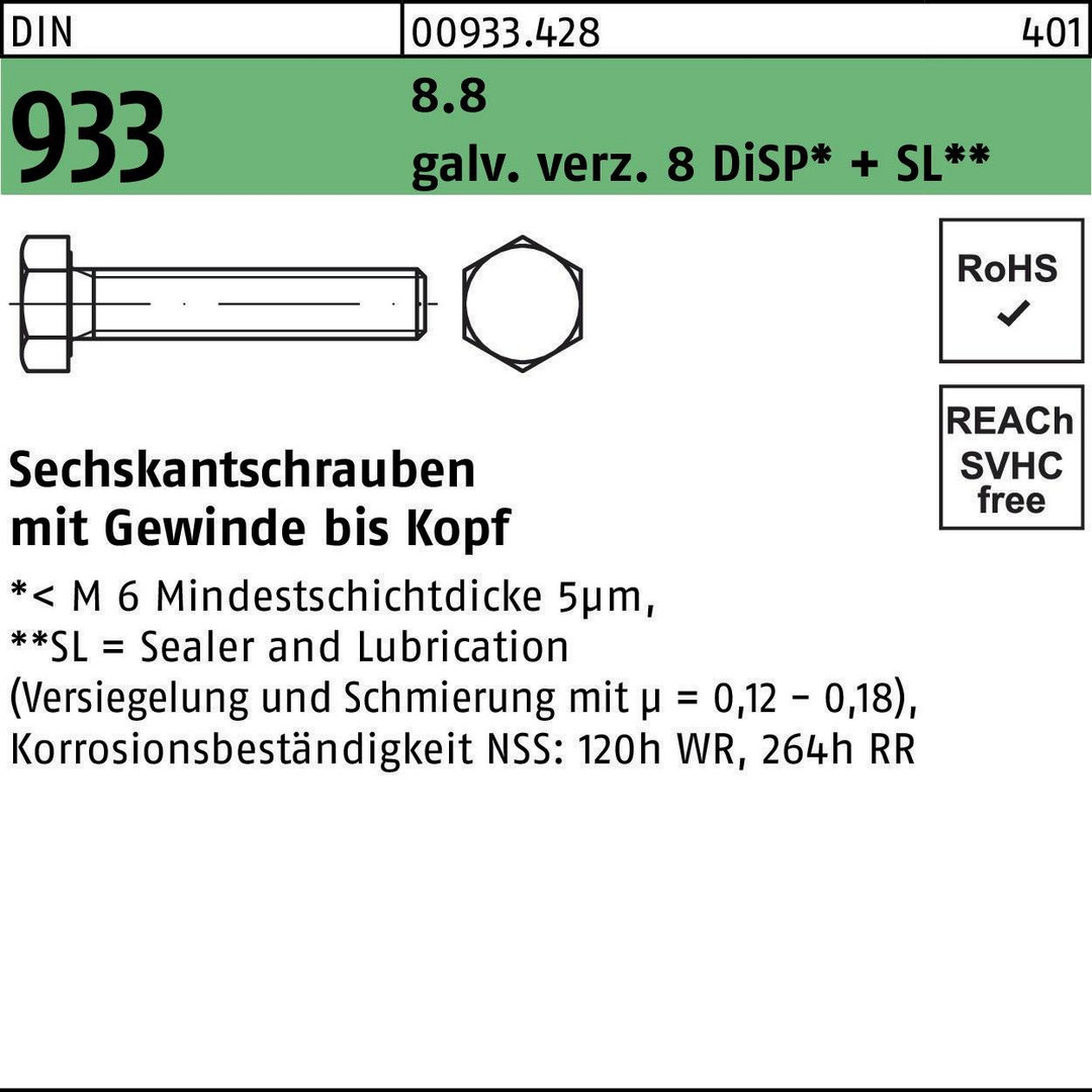 DIN 933 8.8 galv. verz. 8 DiSP + SL Sechskantschrauben mit Gewinde bis Kopf - Abmessung: M 4 x 6 VE=S (500 Stück )
