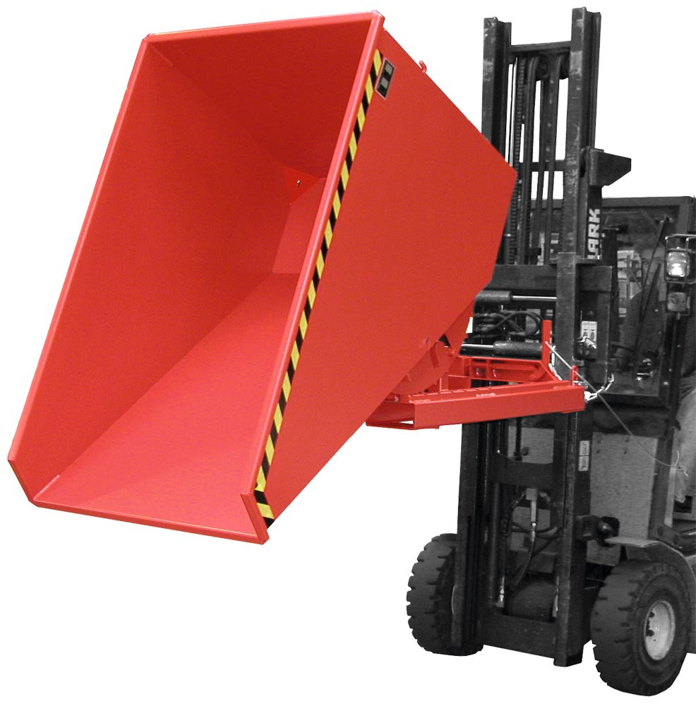 · Robuste Stahlblechkonstruktion, 3 mm Wannenblech mit umlaufend Randprofil · Siebblech und Ablasshahn 1" zum Trennen der Flüssigkeiten von Feststoffen · Öl- und wasserdicht · Günstiger Lastschwerpunkt · Kippen in jeder Höhe per Seilzug vom Staplersitz aus · Nach erfolgter Entleerung schwenkt der Behälter selbstständig in die Ladestellung zurück · Stabiler Grundrahmen mit Einfahrtaschen · Sicherung gegen Abrutschen und unbeabsichtigtes Auskippen