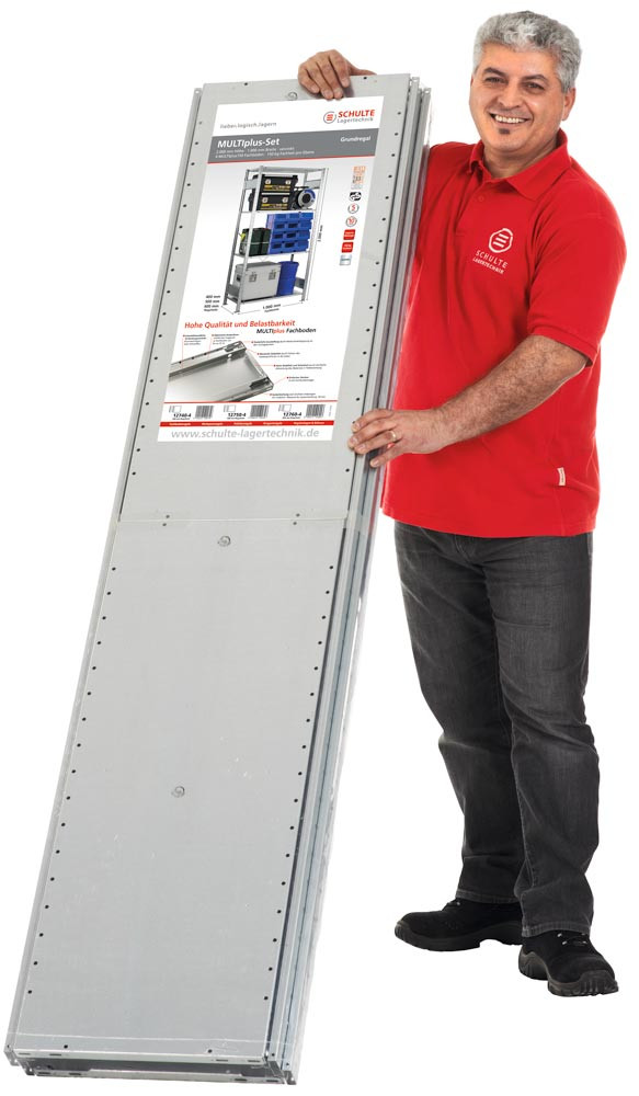 · Stecksystem mit vormontiertem Rahmen · Komplett maschinell in Folie eingeschweißt · Oberfläche sendizimirverzinkt · 4 Fachböden mit integrierter Systemlochung, höhenverstellbar im Raster von 25 mm · Traglast je Boden 150 kg (bei gleichmäßig verteilter Last)