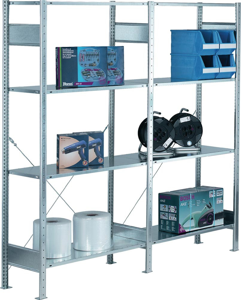 · Stecksystem mit vormontiertem Rahmen · Komplett maschinell in Folie eingeschweißt · Oberfläche sendizimirverzinkt · 4 Fachböden mit integrierter Systemlochung, höhenverstellbar im Raster von 25 mm · Traglast je Boden 150 kg (bei gleichmäßig verteilter Last)