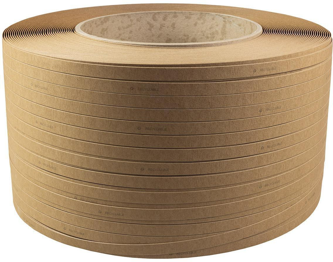 Nachhaltige Alternative zu herkömmlichen PP-Umreifungsbändern Papier-Umreifungsband besteht zu 95% aus Kraftpapier und zu 5% aus Pflanzenleim Es bietet eine umweltfreundliche Lösung für das Verschließen und Bündeln leichter Packstücke im Innenbereich. Visuelle Umweltfreundlichkeit: Neben seiner natürlichen Optik unterstreicht der Aufdruck ″100% recyclable″ die umweltbewusste und recycelbare Natur dieses Bands aus nachwachsenden Rohstoffen Leichte Handhabung: Das weiche · glatte und flexible Material ermöglicht eine mühelose Verarbeitung · ohne Verletzungsgefahr durch scharfe Kanten. Vielseitig einsetzbar: Das Papier-Umreifungsband kann sowohl manuell als auch maschinell verwendet werden und ist mit den meisten halbautomatischen Umreifungsgeräten sowie automatischen Umreifungsmaschinen kompatibel. Zubehör für manuelle Anwendung: Perfekt für die manuelle Umreifung sind die 13 mm Stahl-Verschlussklammern sowie die Verschlussschnallen aus Kunststoff. Hauptmerkmale im Überblick: Umweltfreundlicher Aufdruck Breite: 12 mm Länge des Bands: 2000 Meter Durchschnittliche Reißfestigkeit: Zwischen 45 und 55 kg