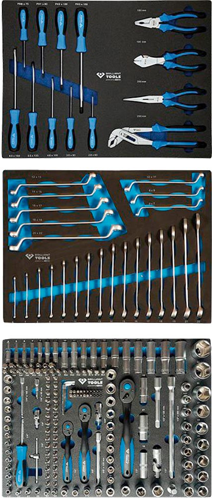 ∙ 7 Schubladen bestückt mit 207 bzw. 473 Werkzeugen ∙ Einzelverriegelung verhindert ungewolltes Öffnen ∙ Zentralverriegelung aller Schubladen durch Zylinderschloß ∙ Kantenschutz aus Kunststoff ∙ Rollen mit 2 Lenk- und 2 Bockrollen ∙ Belastbarkeit der Schubladen 35 kg, Gesamttragkraft 400 kg ∙ Gesamtmaße B x T x H 770 x 470 x 975 mm ∙ Kugelgelagerte Schubladen mit Vollauszug