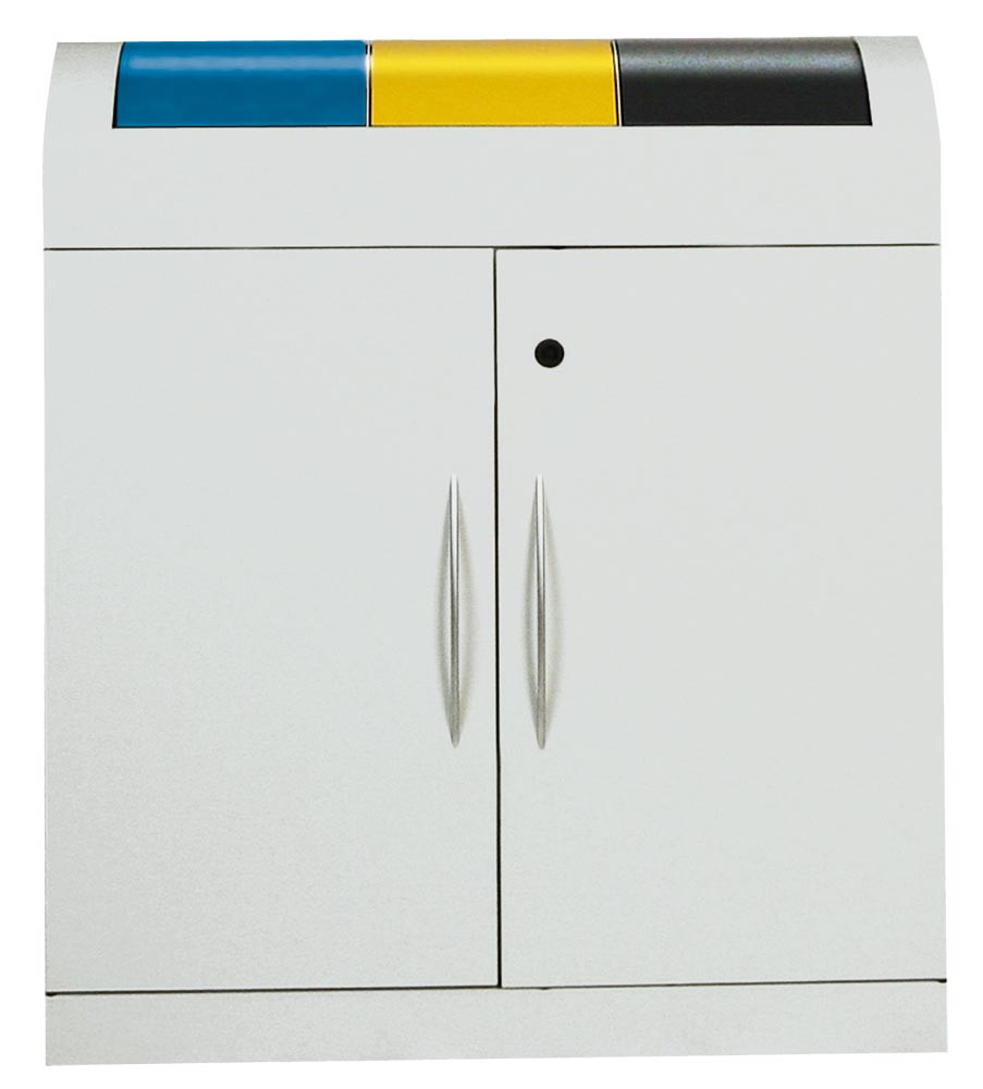 Werstoffsammelstation, 3x45 Liter, BxTxH 860x320x975 mm, Korpus RAL 7035 lichtgrau, Schwingdeckel blau+gelb+anthrazit