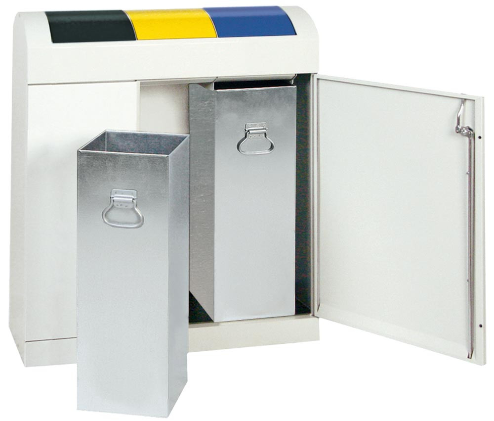 Werstoffsammelstation, 3x45 Liter, BxTxH 860x320x975 mm, Korpus RAL 7035 lichtgrau, Schwingdeckel blau+gelb+anthrazit E815585