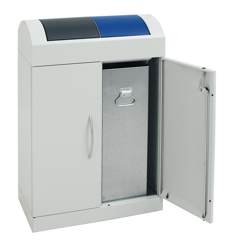 Werstoffsammelstation, Volumen 2x45 Liter, BxTxH 620x320x975 mm, Korpus RAL 7035 lichtgrau, Schwingdeckel blau + anthrazit