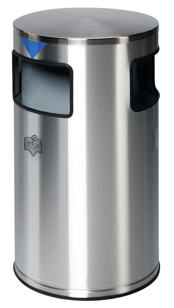 · 3 Einwürföfffnungen · Einsätze aus verzinktem Stahlblech mit einem Volumen von ca. 20 Litern · Abnehmbarer Deckel aus Edelstahl · Bodenbereich mit Kantenschutz augerüstet · Durchmesser 425 mm, Höhe 750 mm · Inklusive Pikogramme Wertstoffe (Farbecke gelb), Restmüll (Farbecke silber) und Papier (Farbecke blau)