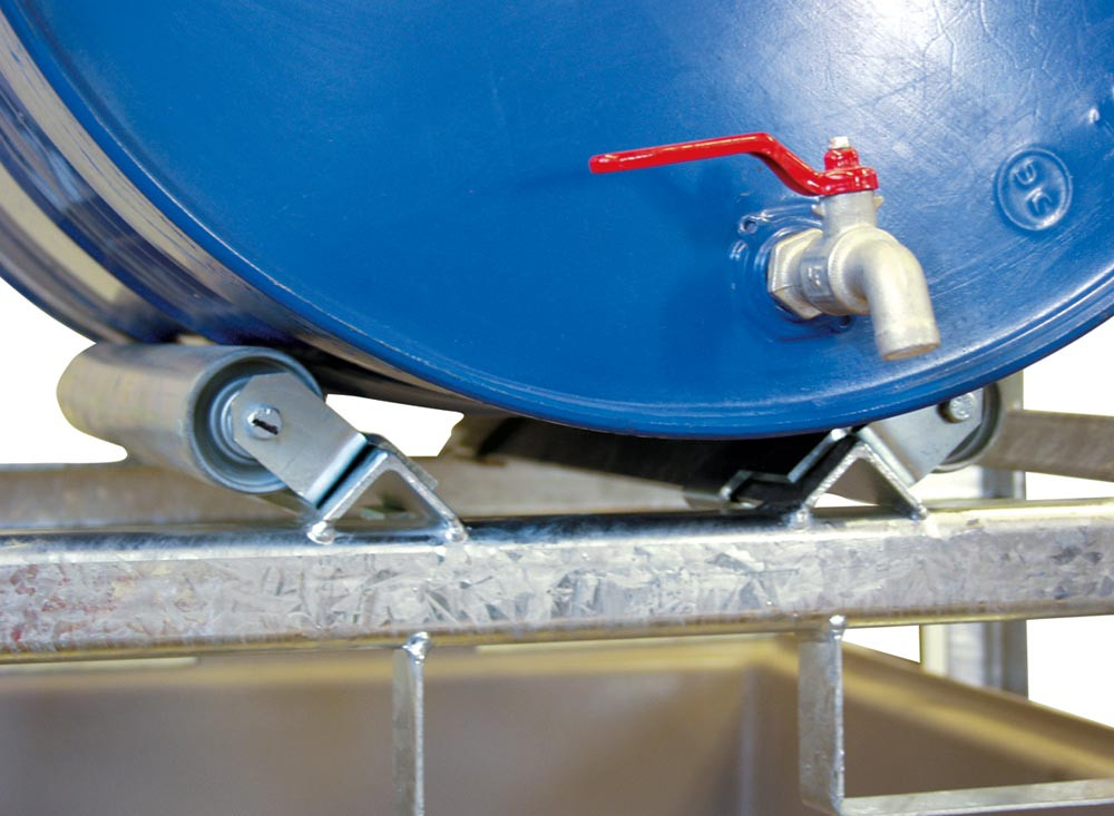 Zubehör zur Fassregalen mit 220-l-GFK-Auffangwanne: Drehbare Rollenauflage für 200-l-Fässer